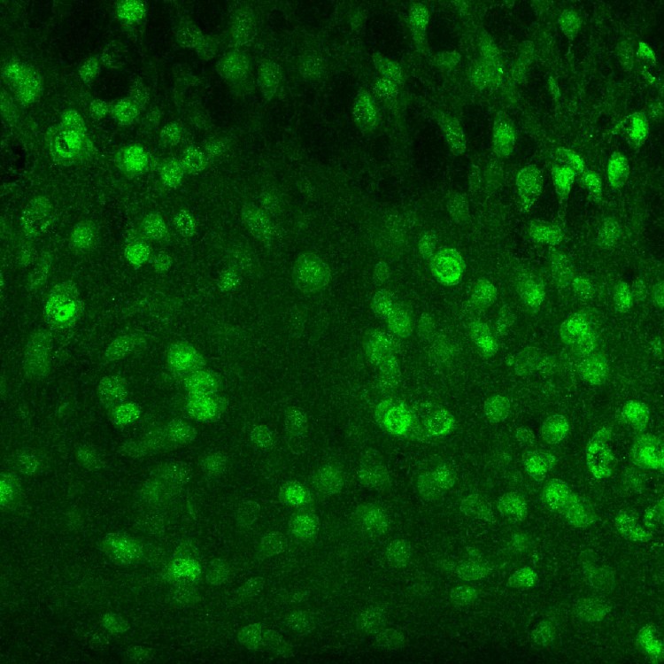 human mutant ATXN3 (green) nuclear accumulation in pontine neurons of YACMJD84.2 transgenic mice.