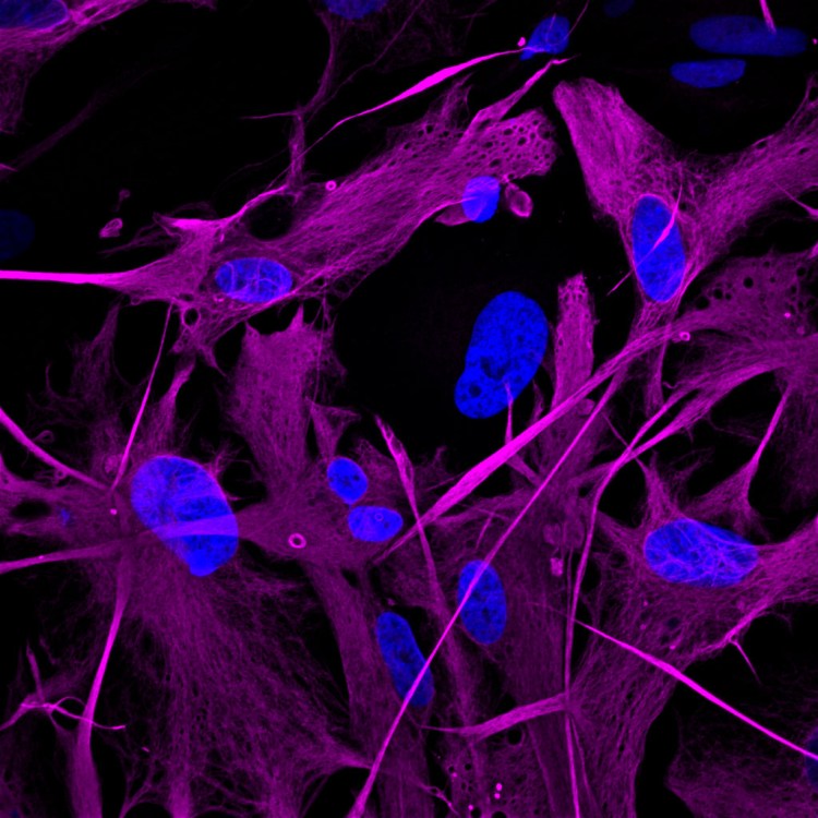 SCA3 hESC-derived astrocytes expressing GFAP (purple). Cell nuclei are detected with DAPI (blue). unpublished