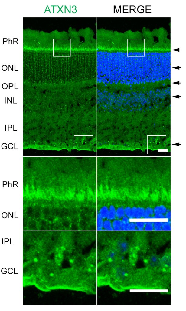 Human mutant ATXN3 (green) accumulates in the phoreceptors (PhR), outer nuclear layer (ONL), outer plexiform layer (OPL), inner nuclear layer (INL) and ganglion cell layer (GCL) of YACMJD84.2 transgenic mouse retina. Cell nuclei are detected with DAP (blue). Adapted from Toulis et al. 2022