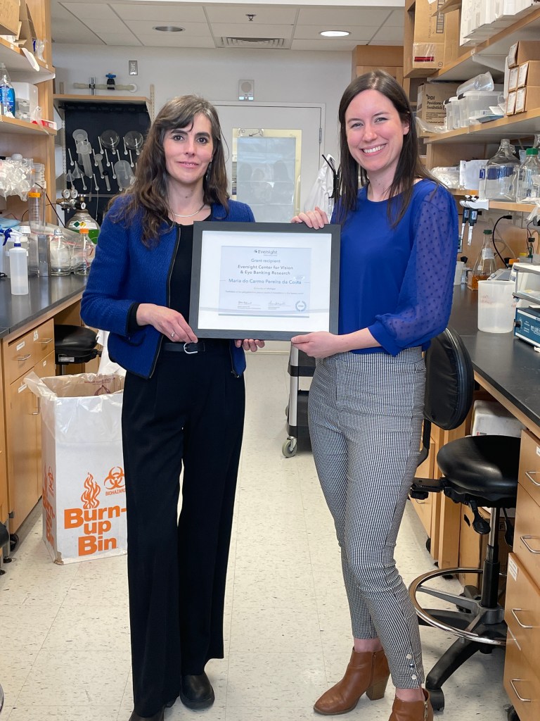 02/10/2023 – Ebony Johnson and Becky Harris from Eversight visit the Costa lab to hand in person the certificate for the Eversight Center for Vision & Eye Banking Research Award to Carmo. The goal of the one-year funded project (January-December 2023) is to define the interactome of the polyglutamine protein ATXN3 in the human retina.