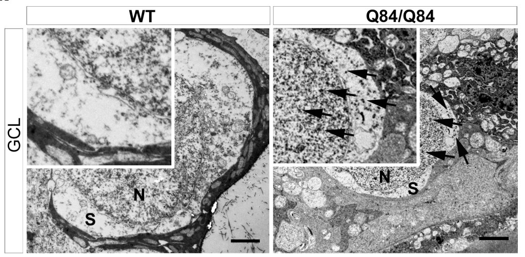 Accumulation of negative electrodense particles in the nuclei and soma of ganglion cells of YACMJD84.2 mouse retina. Adapted from Toulis et al. 2022